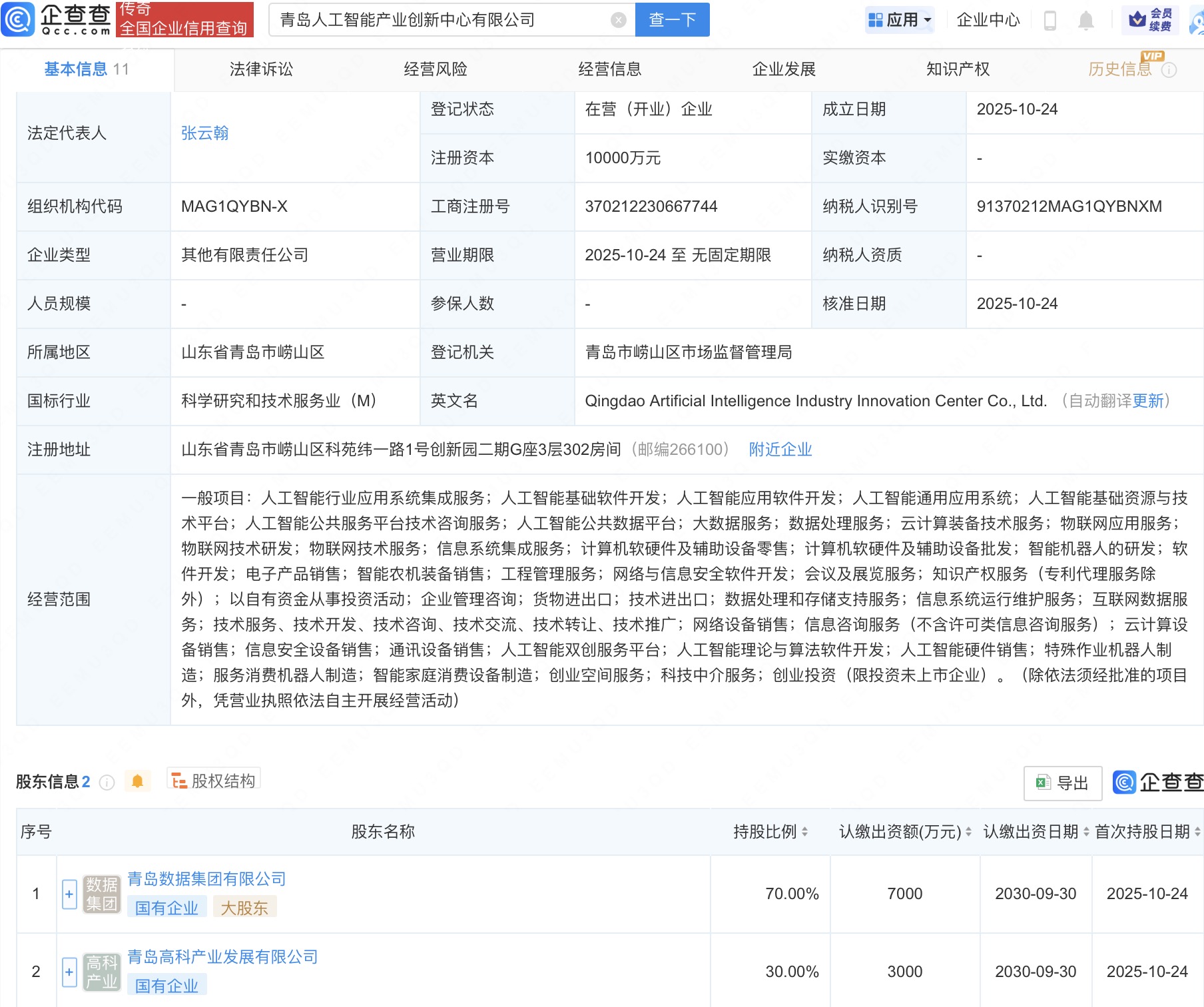 近日,青岛人工智能产业创新中心有限公司成立,法定代表人为张云翰永信证券,注册资本1亿人民币,经营范围包括人工智能行业应用系统集成服务、人工智能基础软件开发、人工智能应用软件开发、人工智能通用应用系统等。企查查股权穿透显示,该公司由青岛数据集团有限公司、青岛高科产业发展有限公司共同持股。